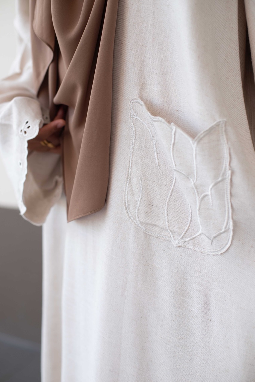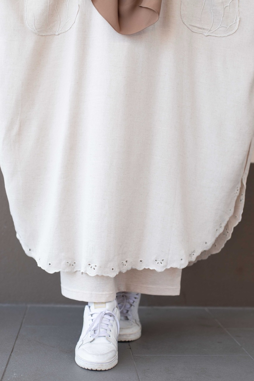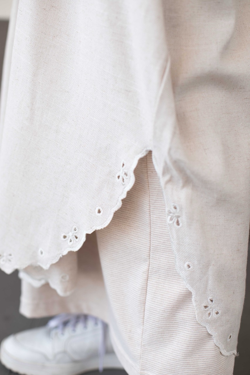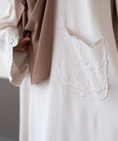 A timeless blend of elegance and comfort. Made from soft cotton linen, featuring delicate embroidery, classic buttons, and a unique patch pocket for a refined touch.