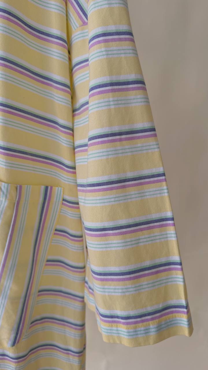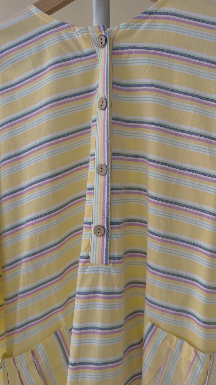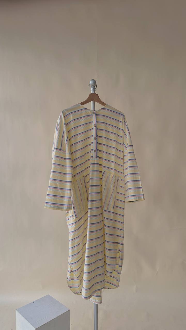 Designed with an oversized, flowy silhouette that allows easy movement, featuring a buttoned front detail and functional front patched pockets for practicality. The striped pattern adds a subtle character while keeping the overall look minimal and timeless.