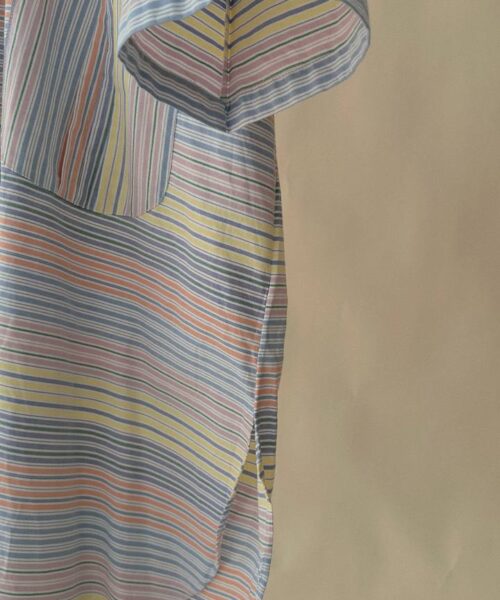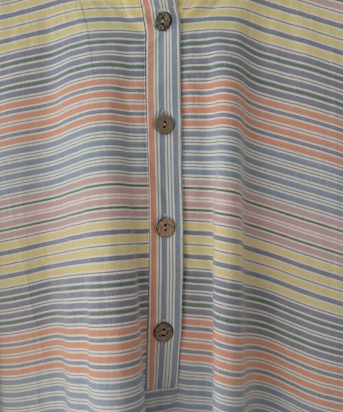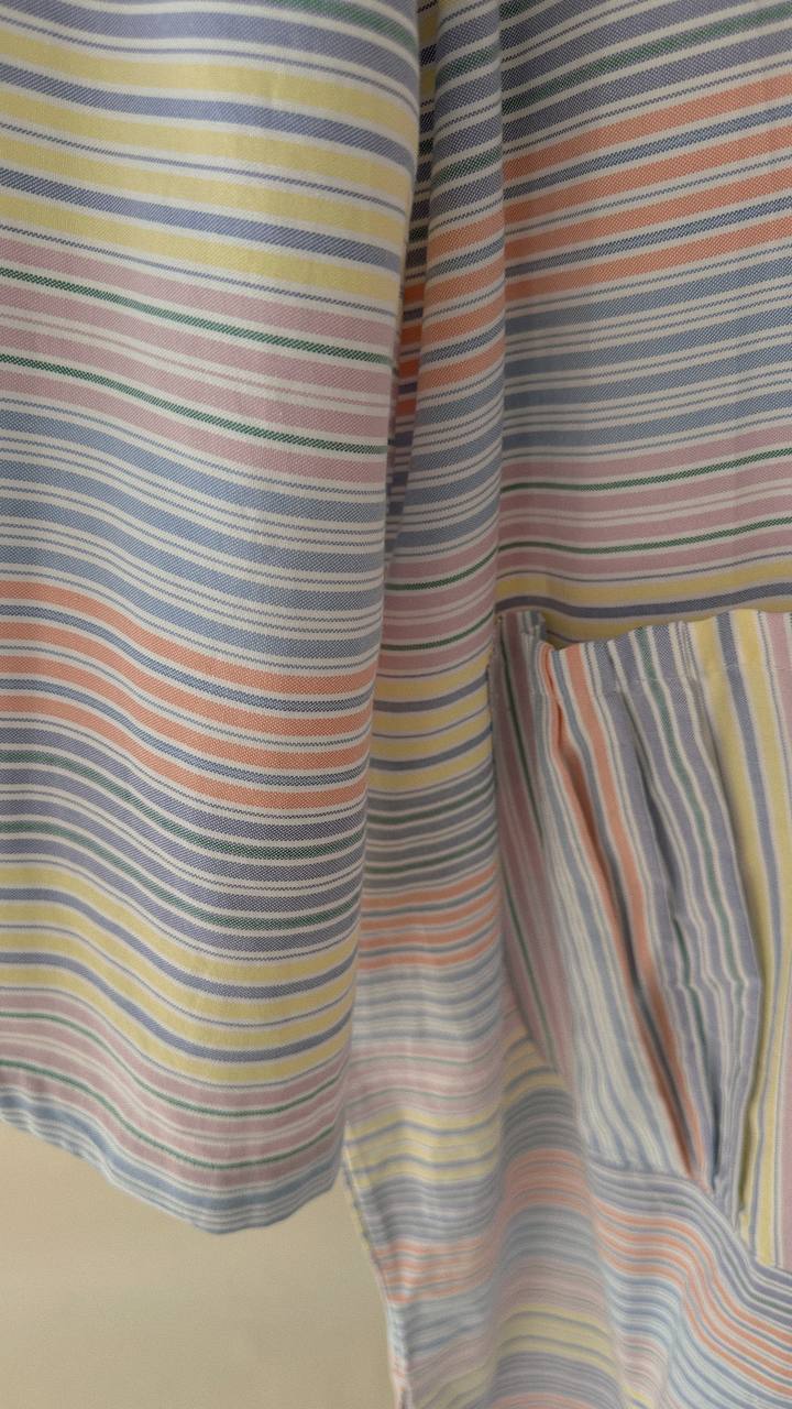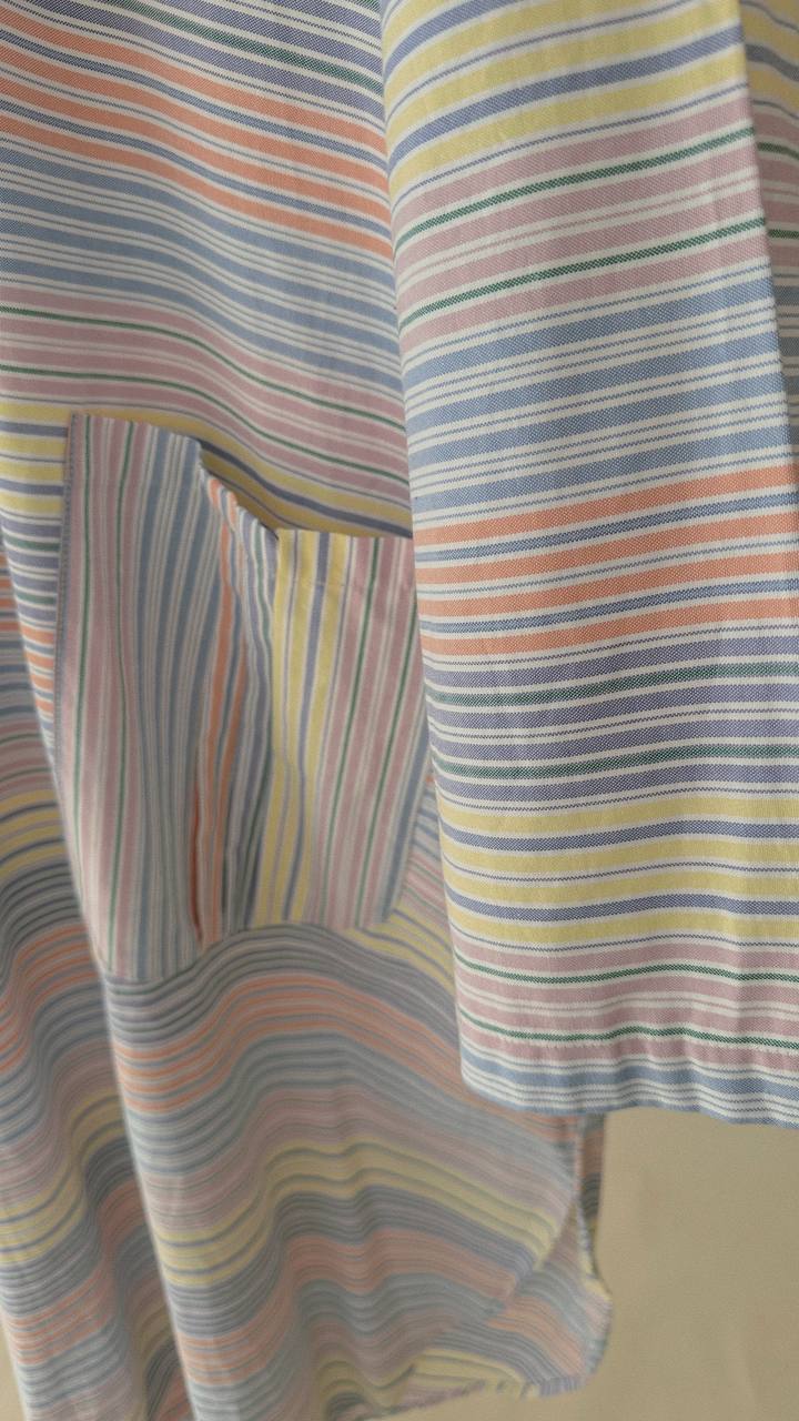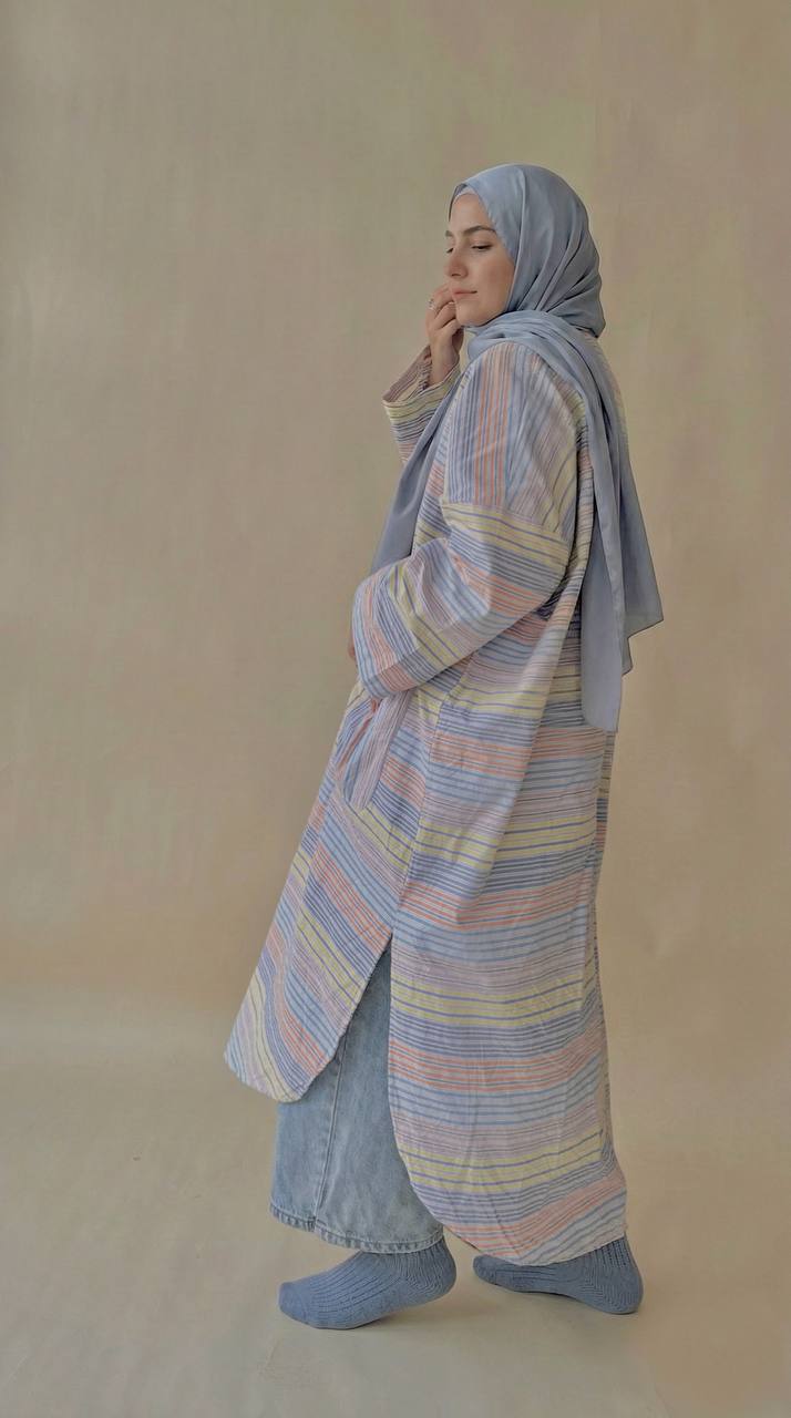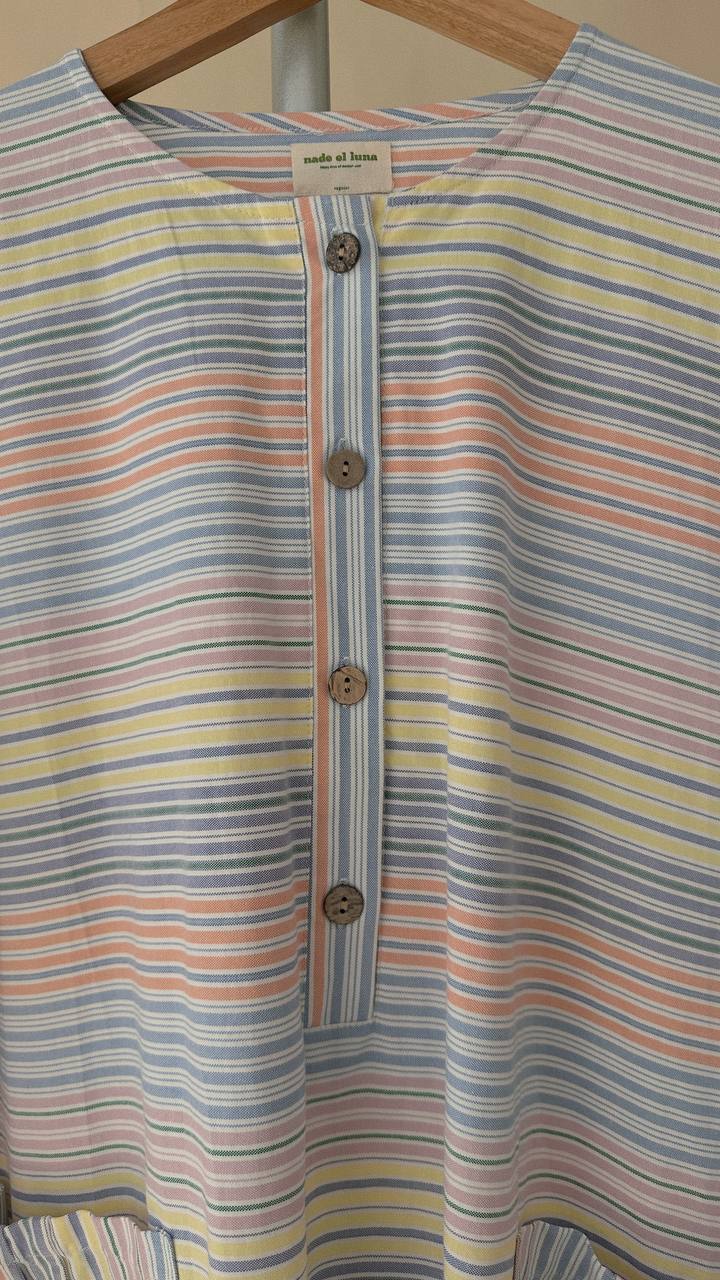 Designed with an oversized, flowy silhouette that allows easy movement, featuring a buttoned front detail and functional front patched pockets for practicality. The striped pattern adds a subtle character while keeping the overall look minimal and timeless.