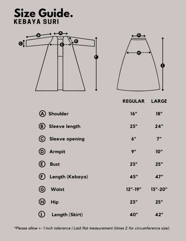 Available in Regular and Large sizes, Kebaya Suri is thoughtfully designed to move beautifully with you, whether for festive occasions or everyday styling.