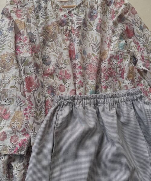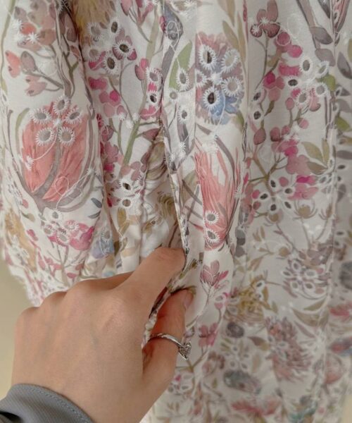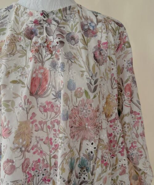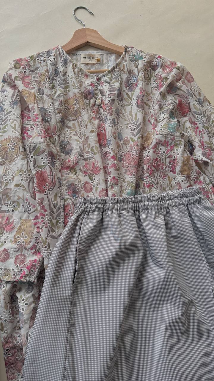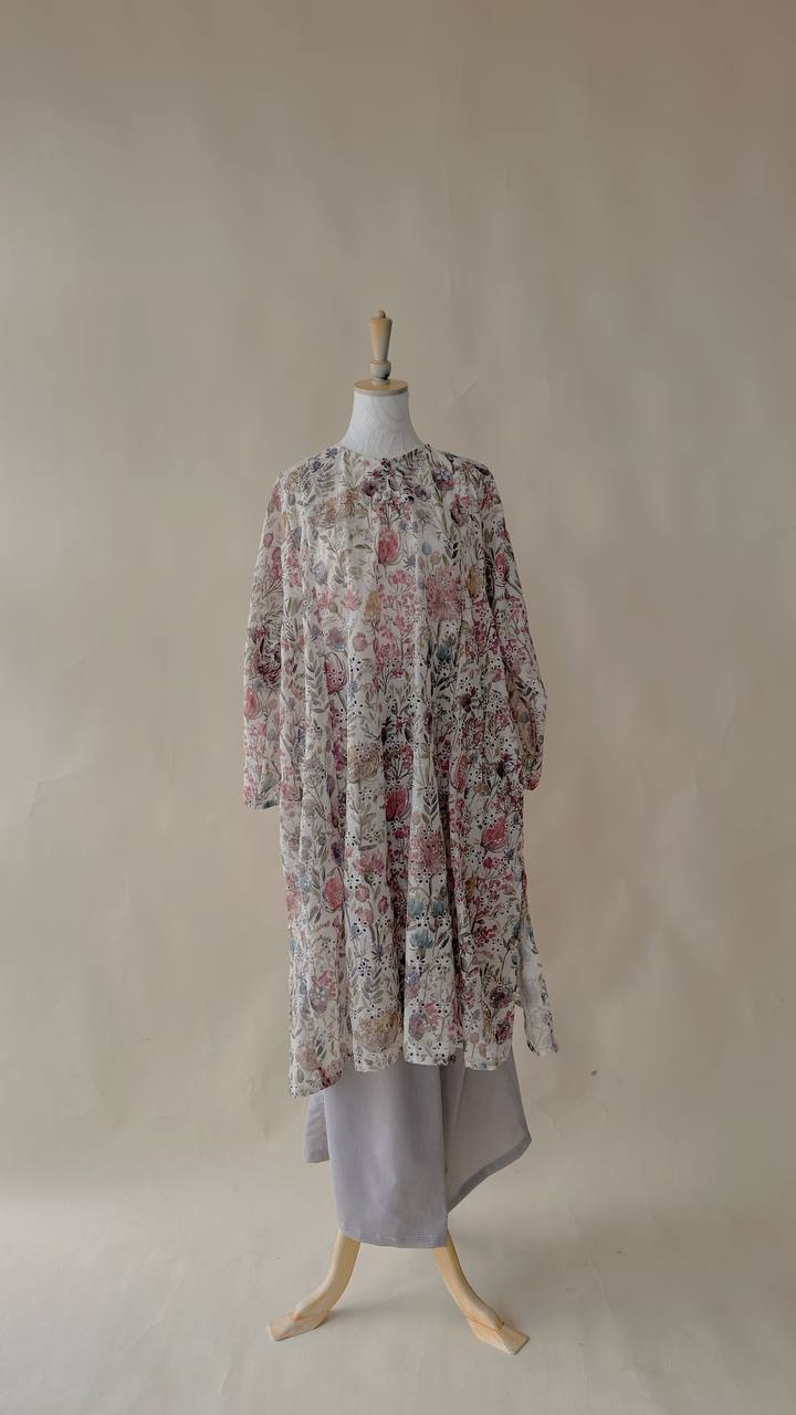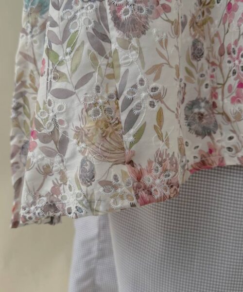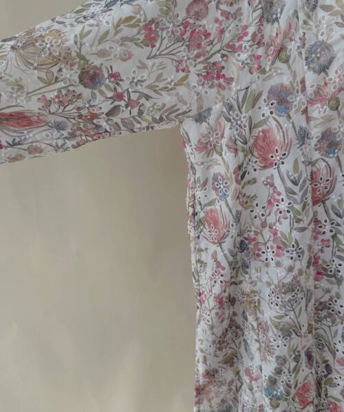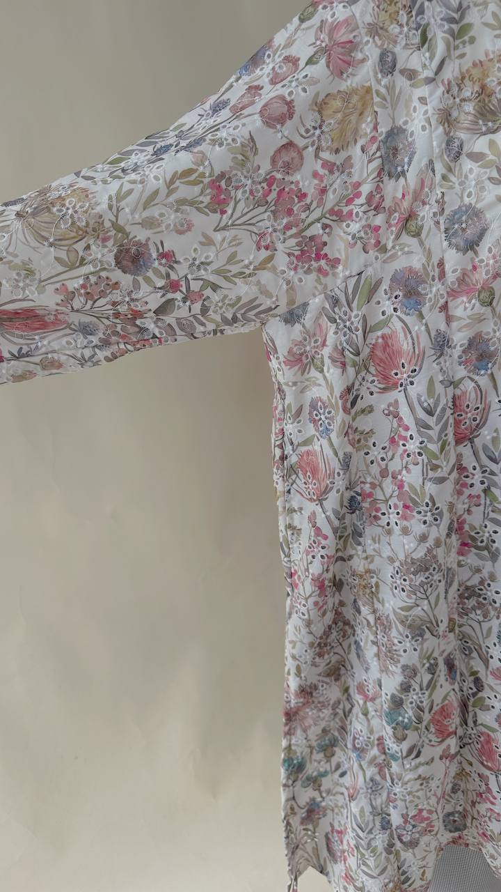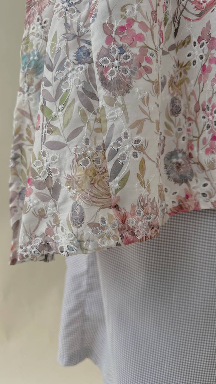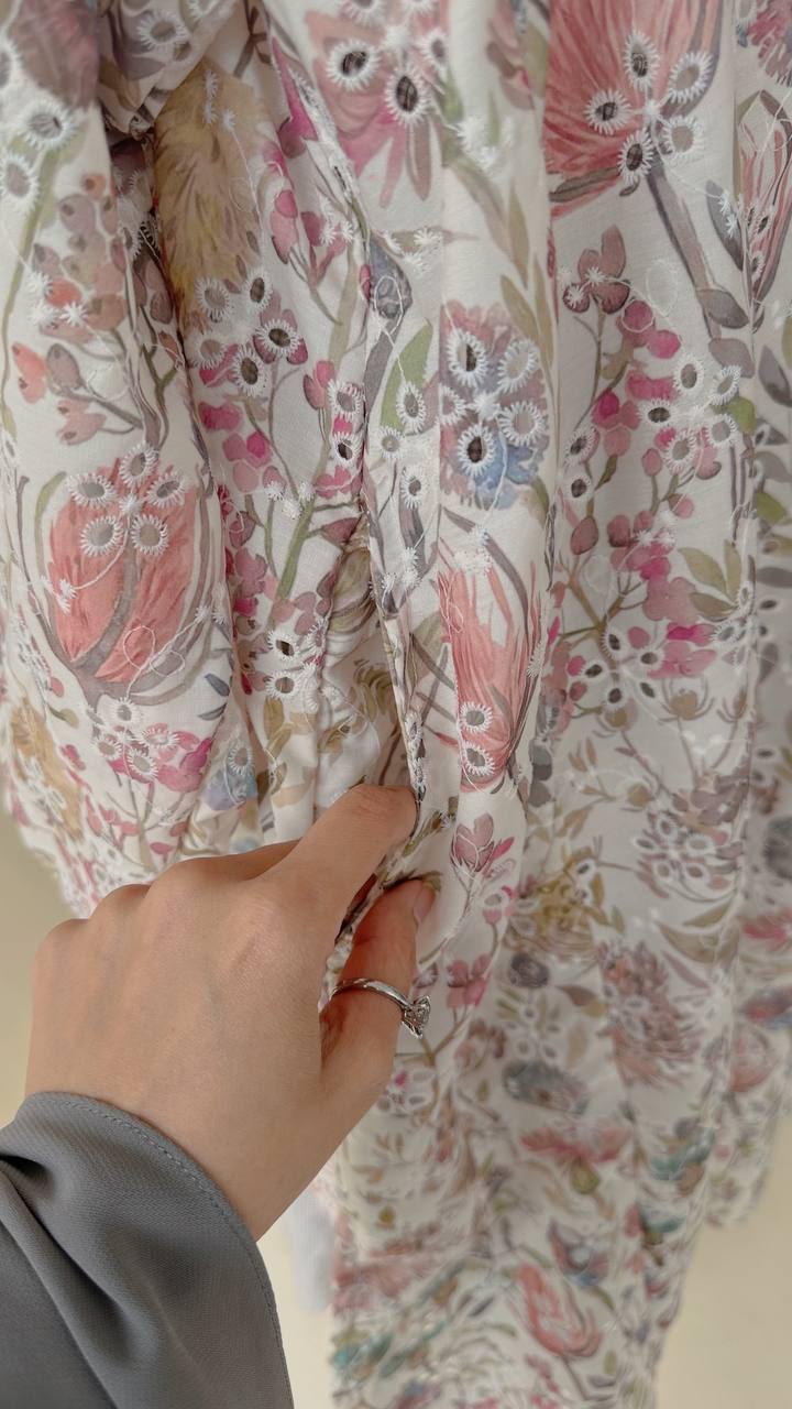 Crafted from 100% embroidered cotton, the fabric features delicate floral and paisley motifs with subtle eyelet cutwork detailing. Lightweight and breathable, it offers comfort throughout the day while maintaining a graceful drape.