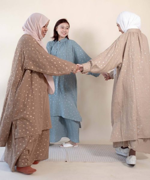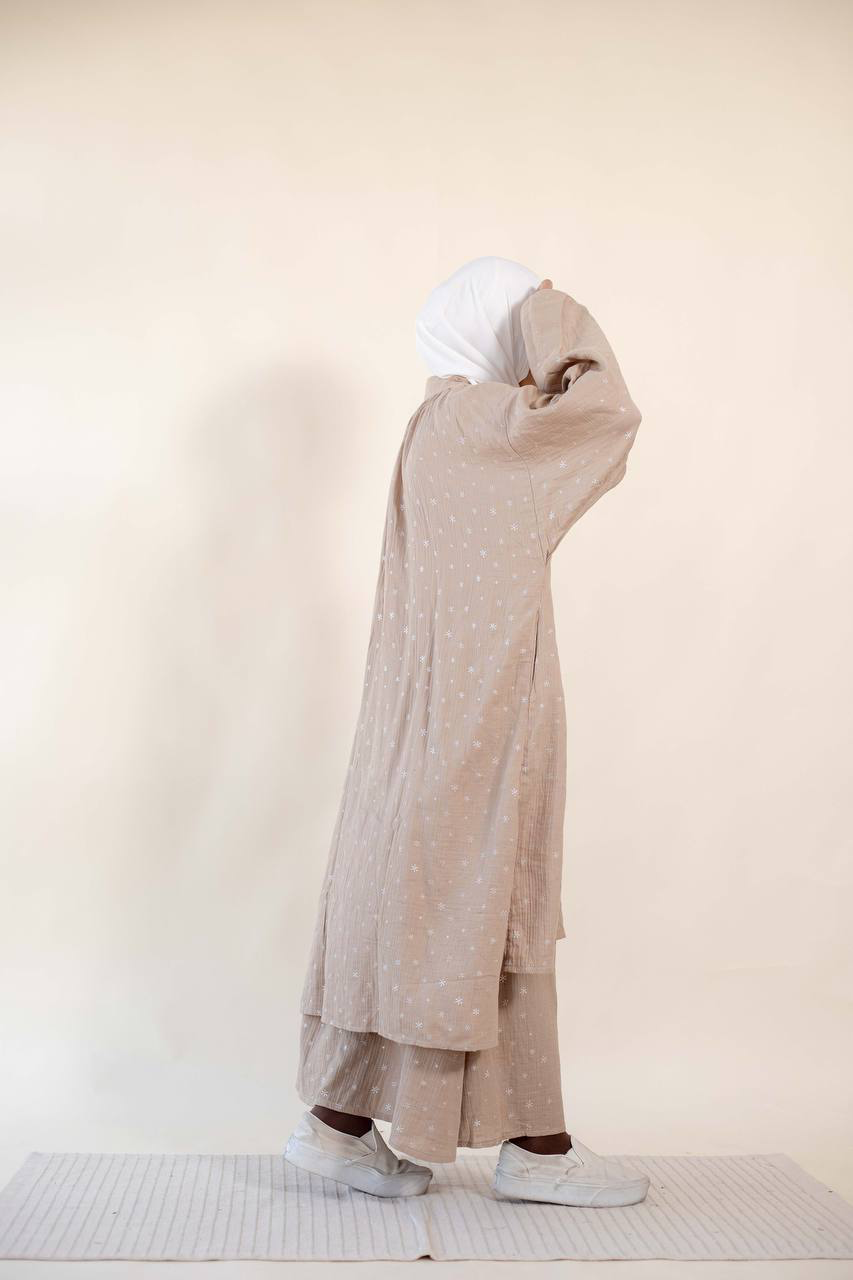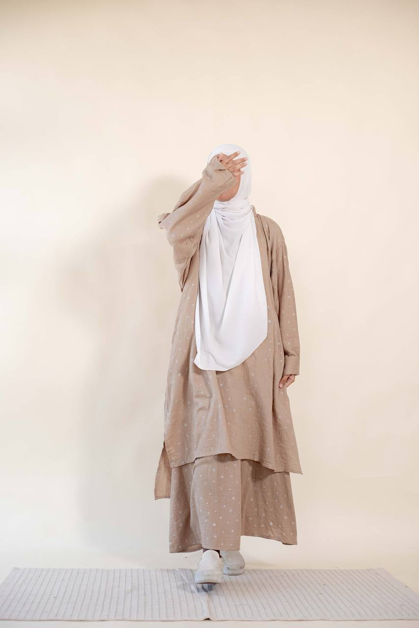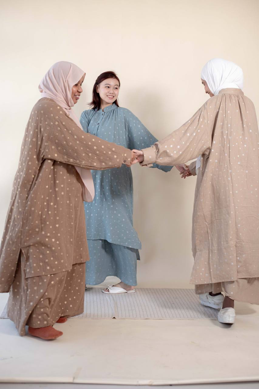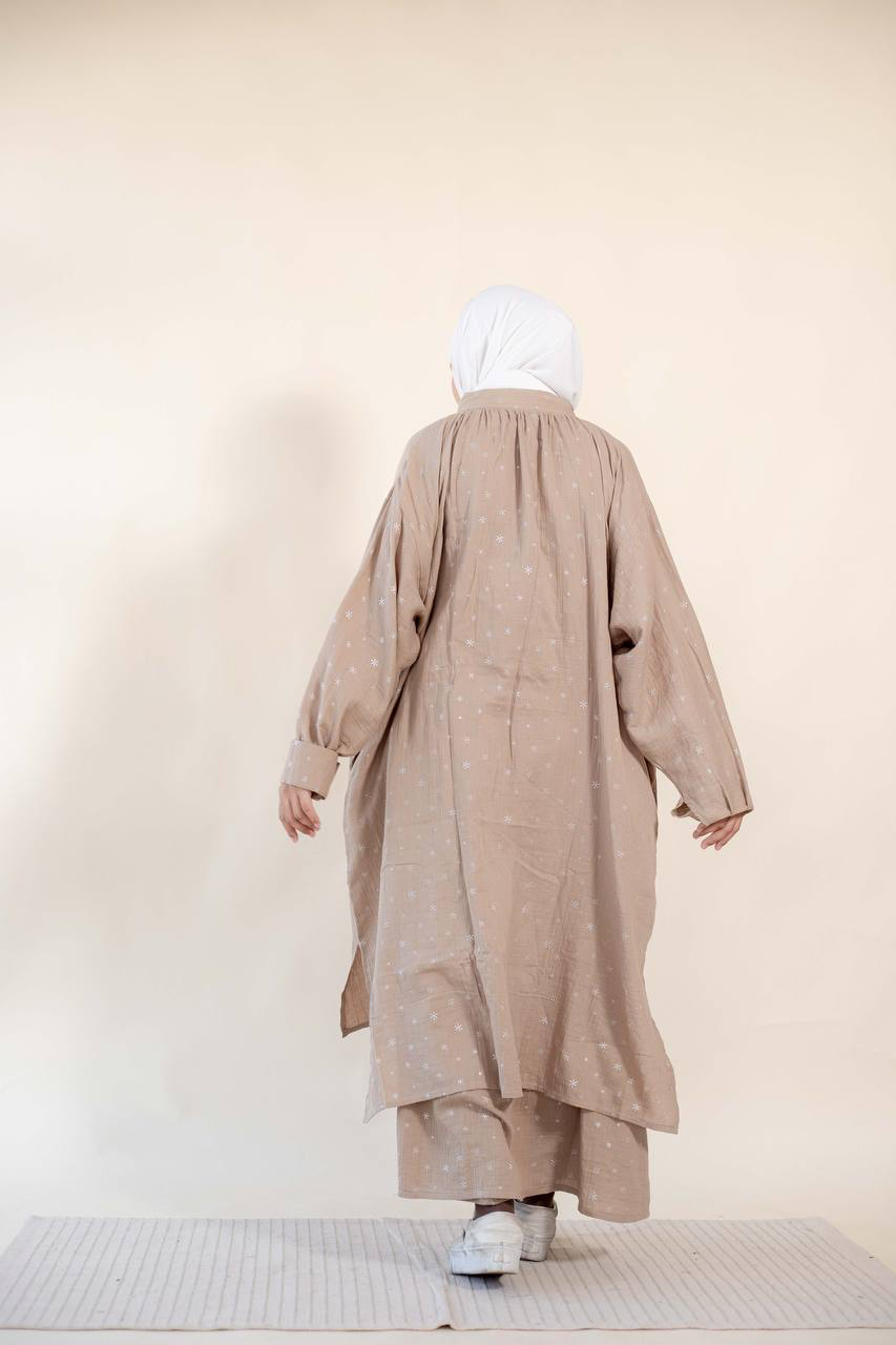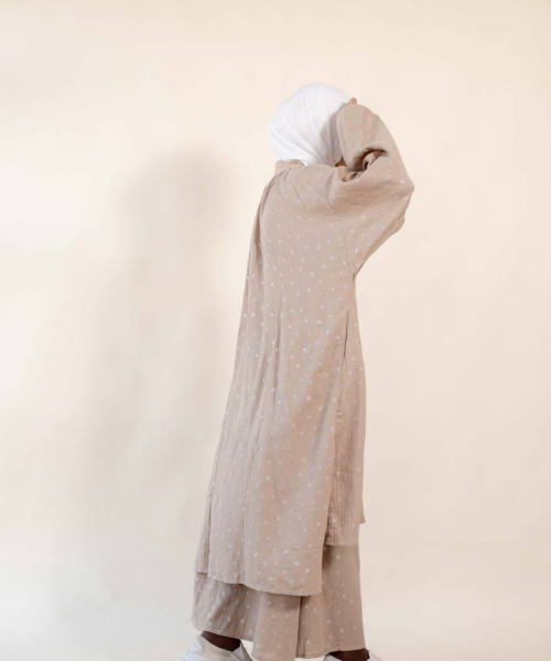 • Material: Textured crinkle fabric (double gauze) styled with minimalist, scattered star motifs.