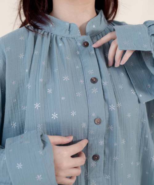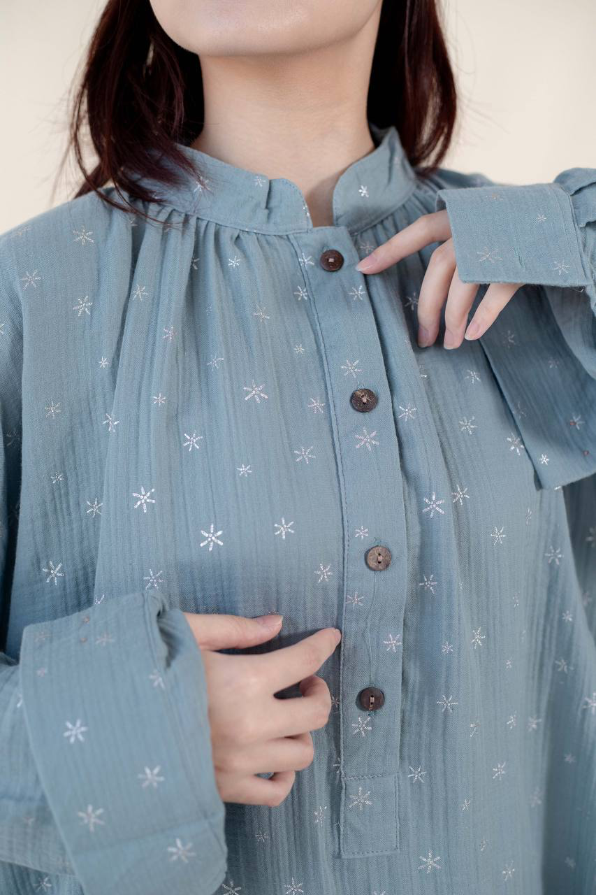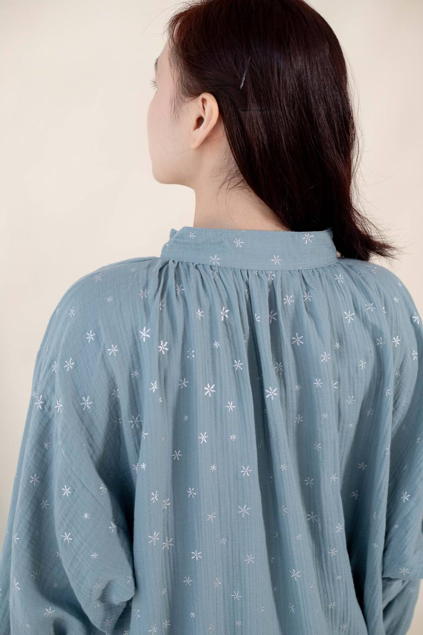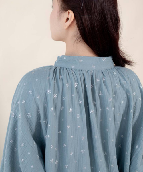 • Mandarin Collar & Gatherings: A neat, simple neckline that creates a beautiful flowy drape.