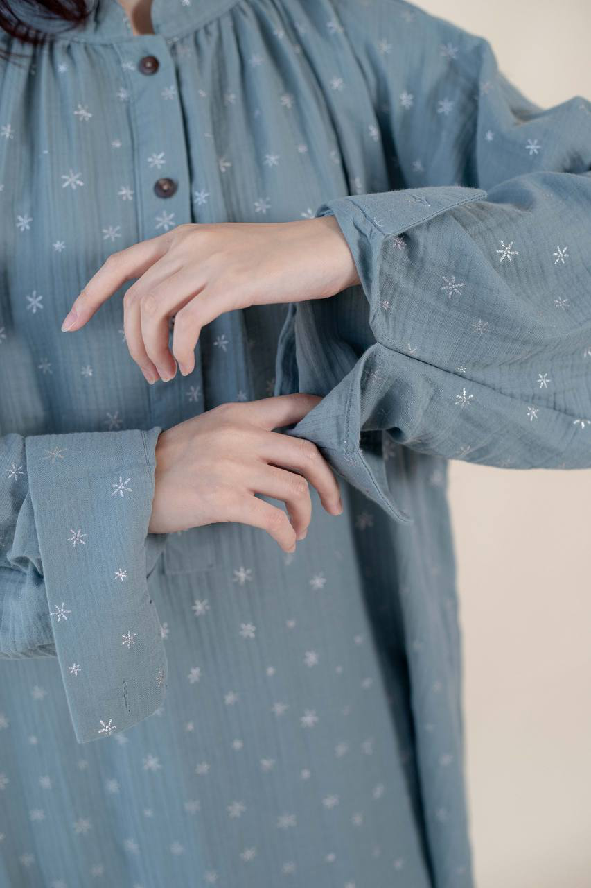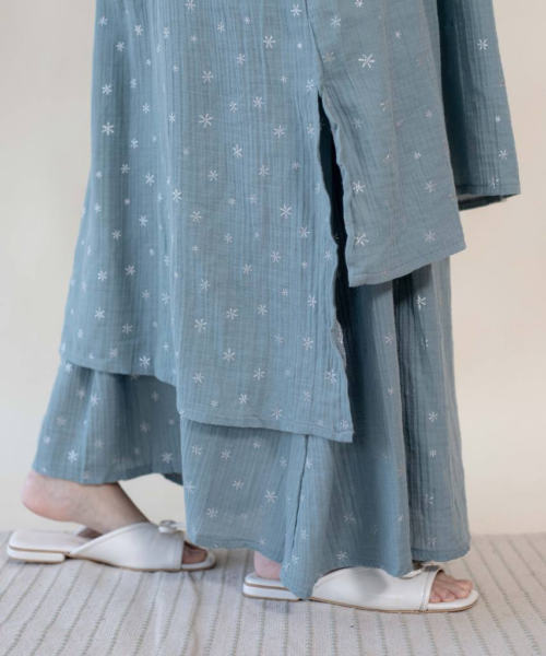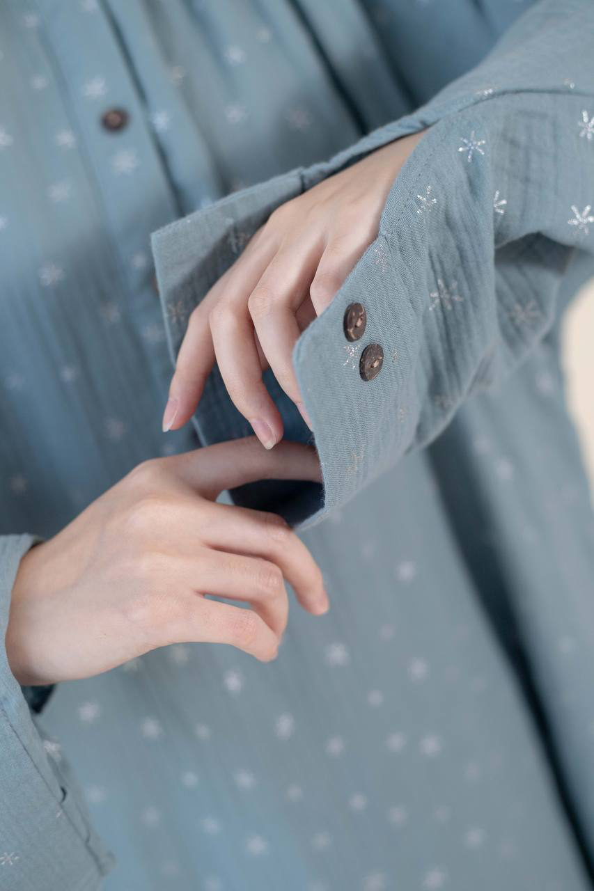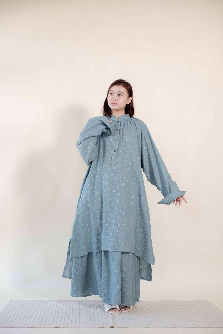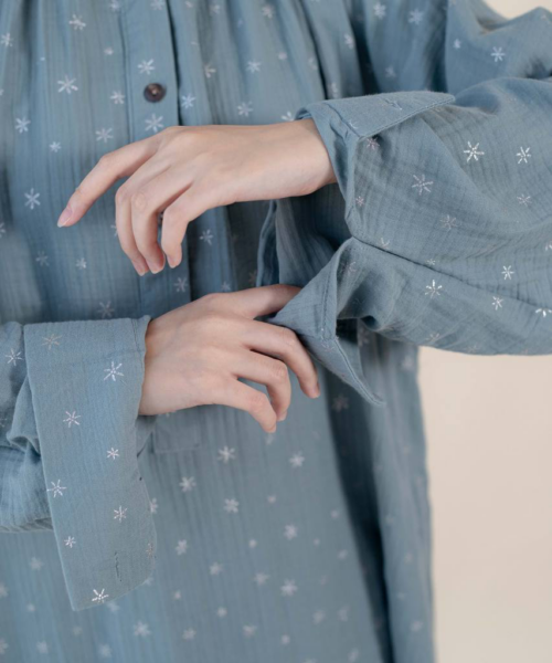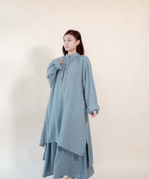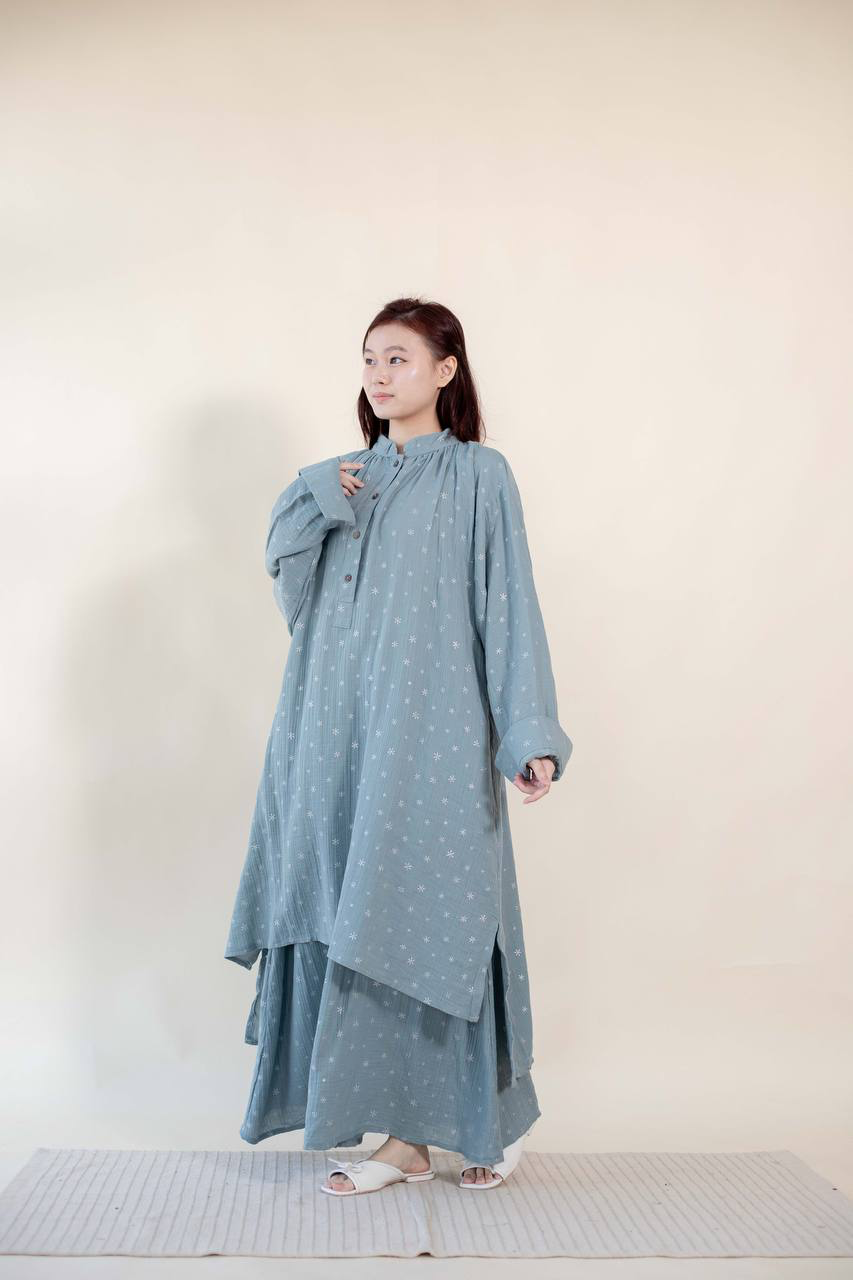 • Material: Textured crinkle fabric (double gauze) styled with minimalist, scattered star motifs.