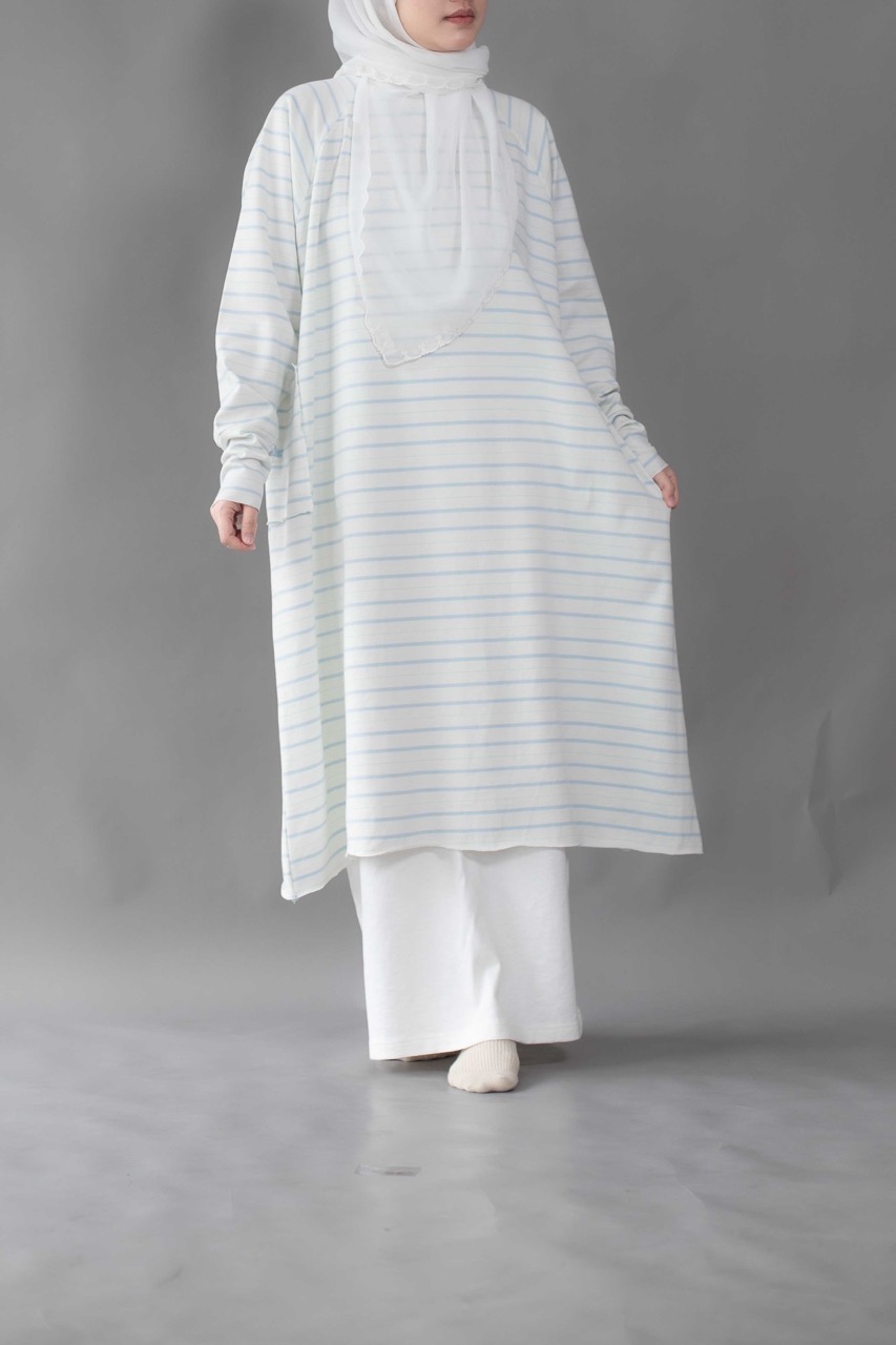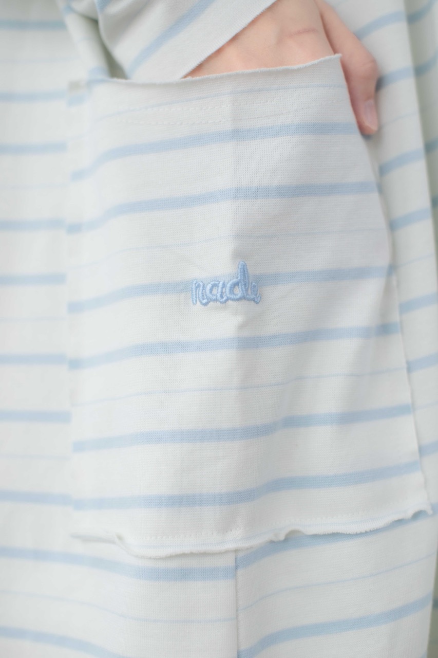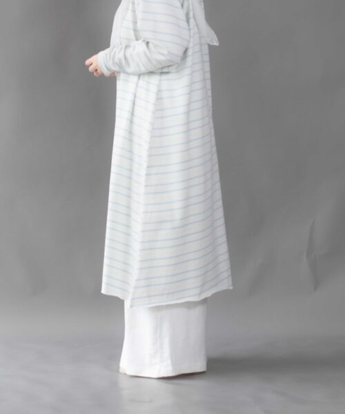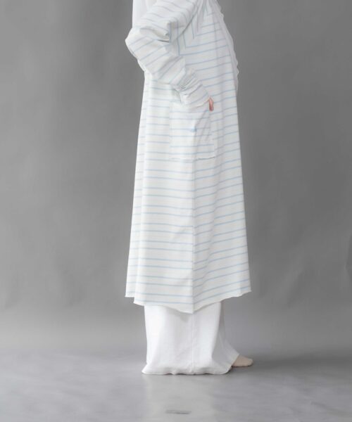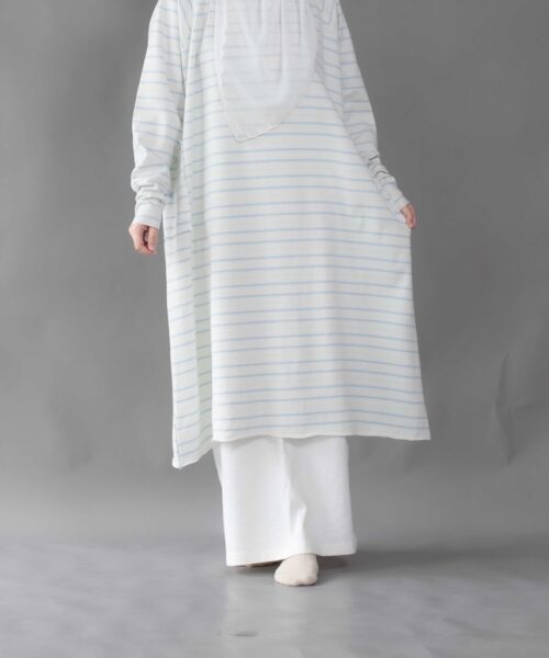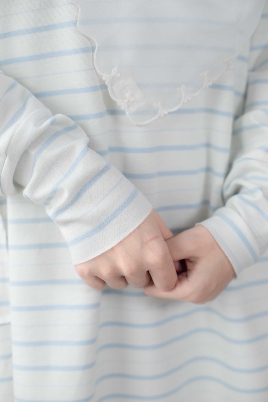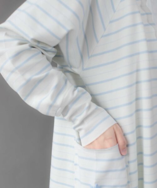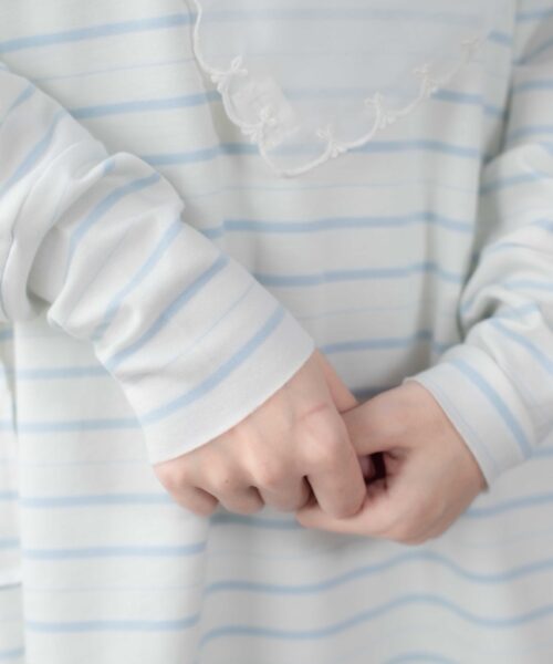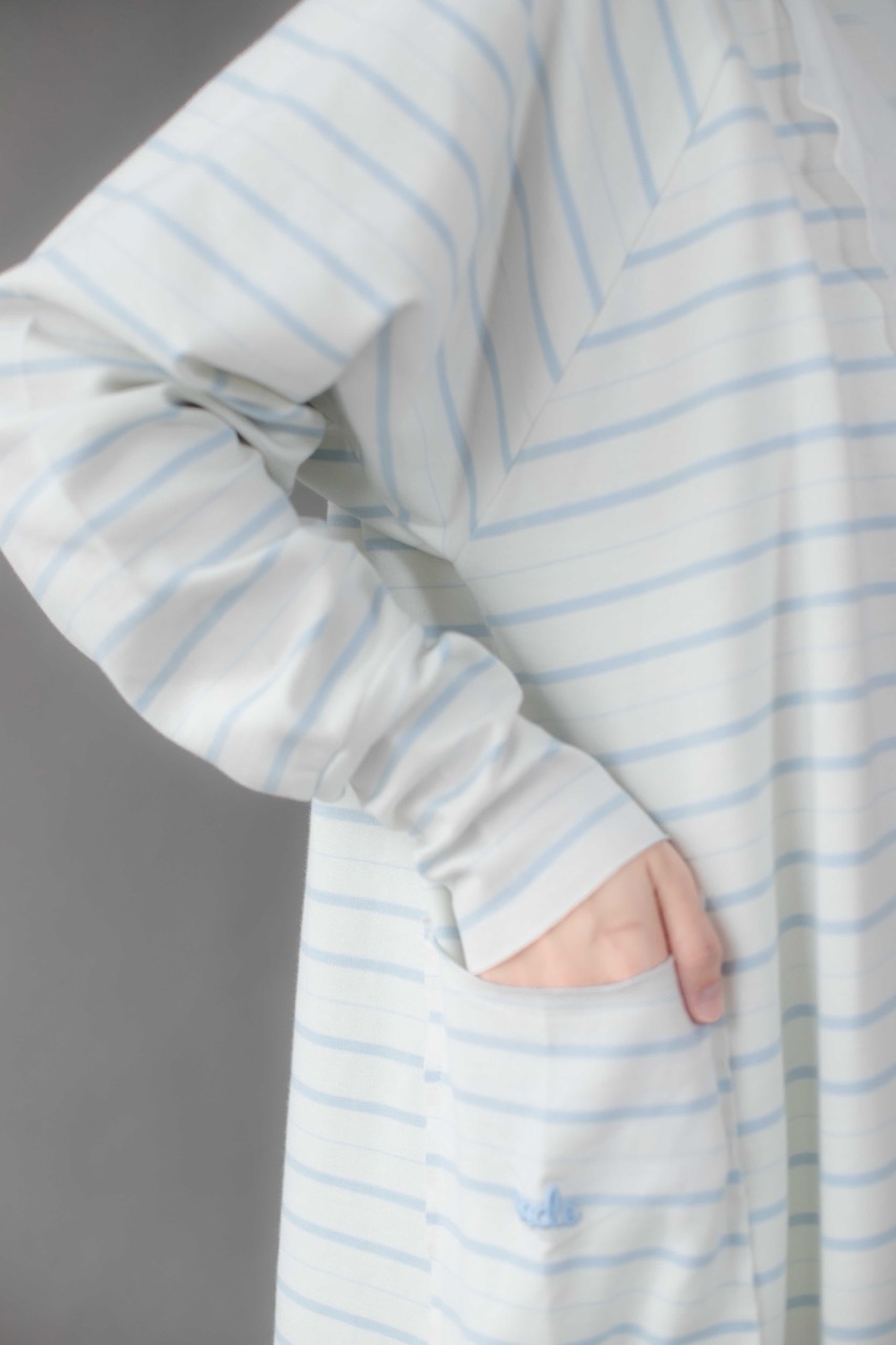 Cute and sophisticated, featuring timeless stripes and colorful, textured fabric. Designed with long raglan sleeves and a round neckline. Cuffed sleeves and raw hemming add a touch of dimension.