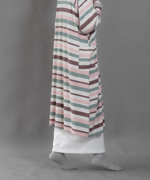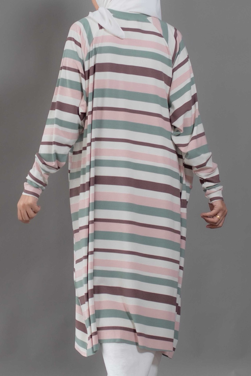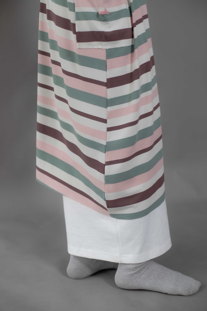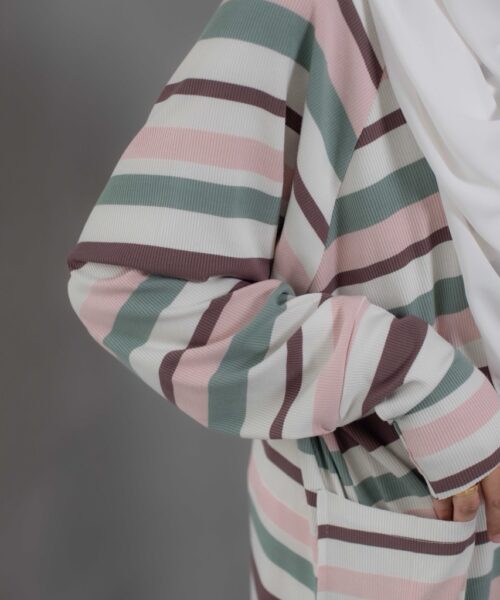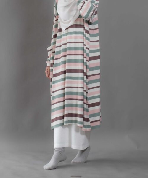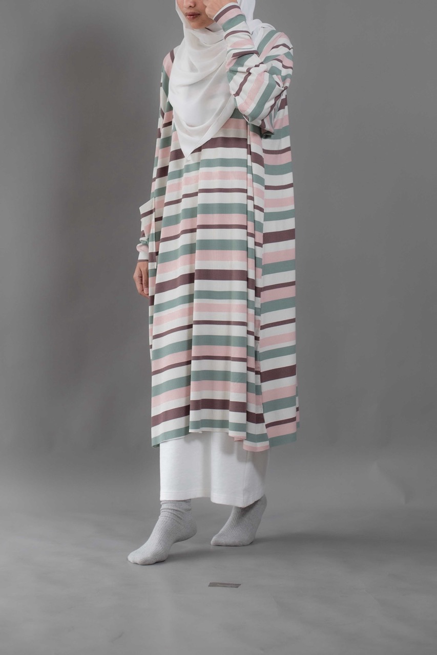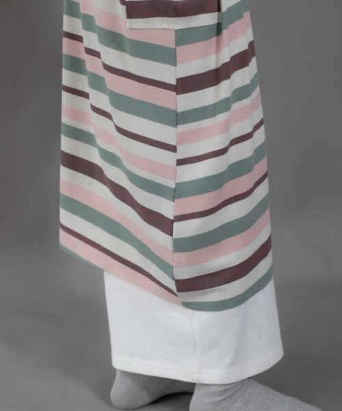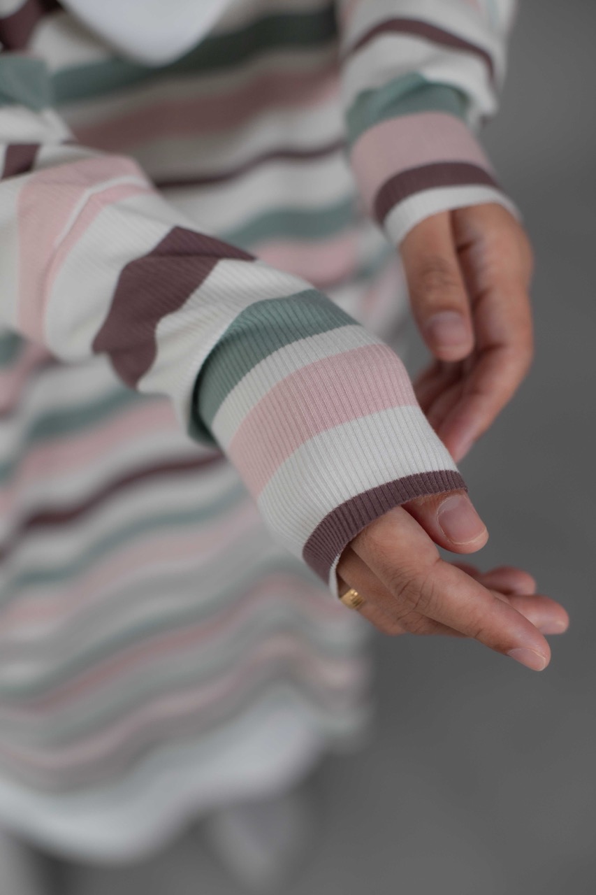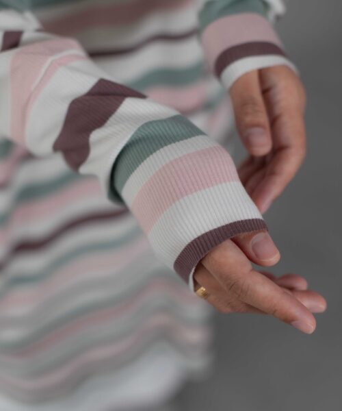 Cute and sophisticated, featuring timeless stripes and colorful, textured fabric. Designed with long raglan sleeves and a round neckline. Cuffed sleeves and raw hemming add a touch of dimension.