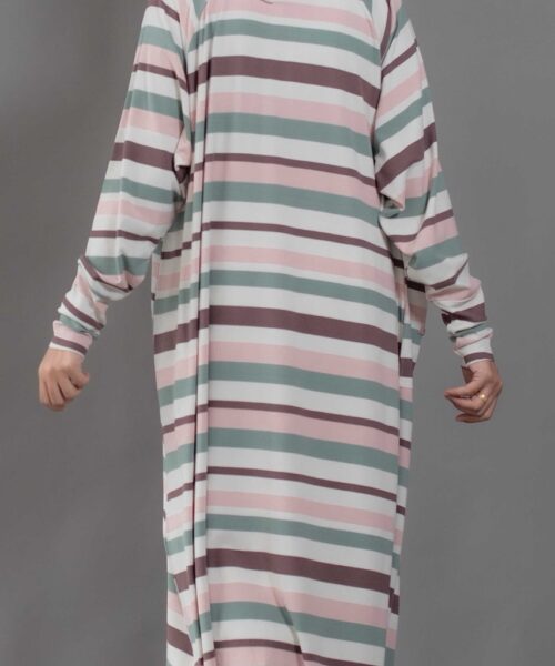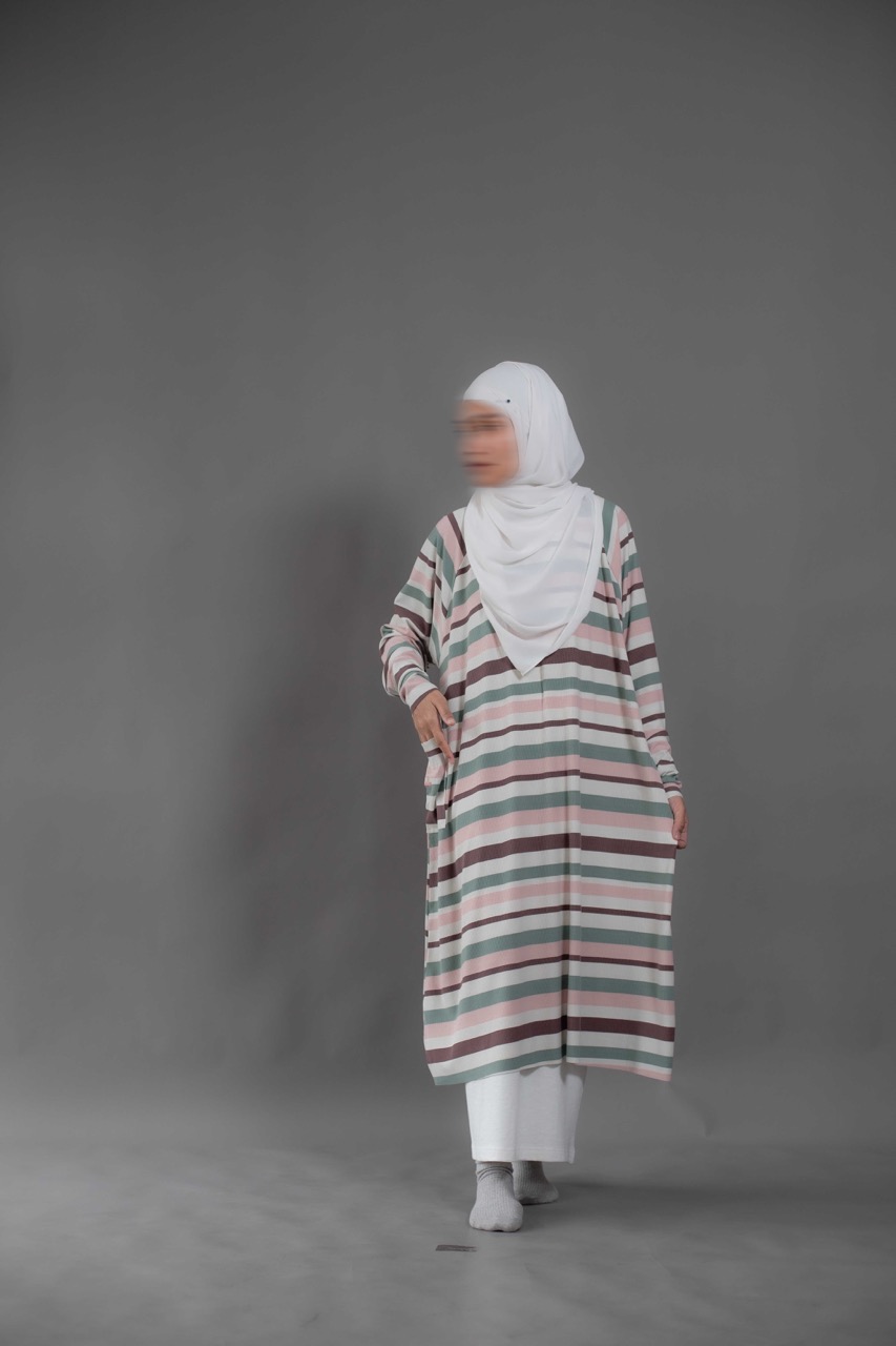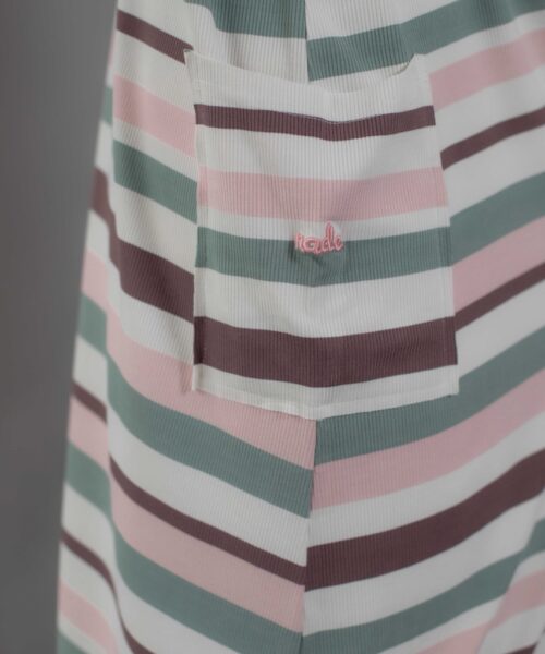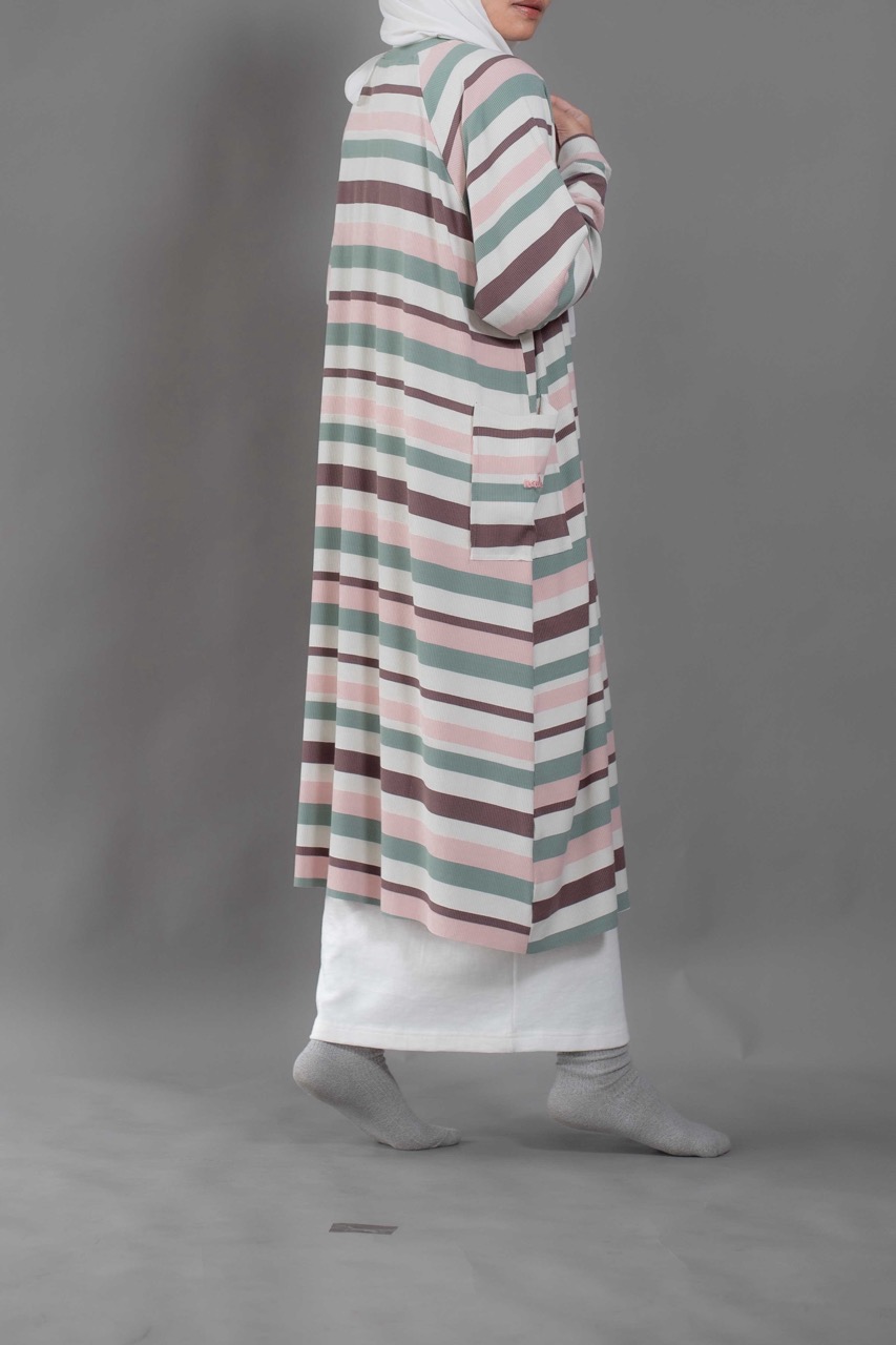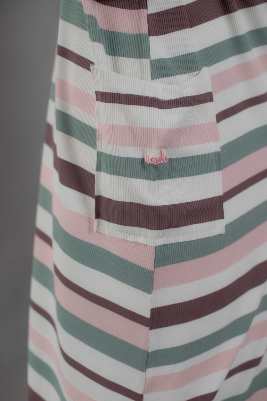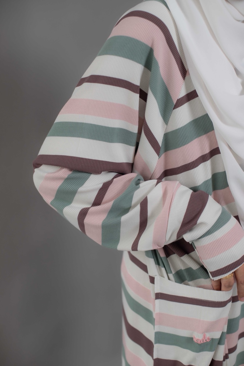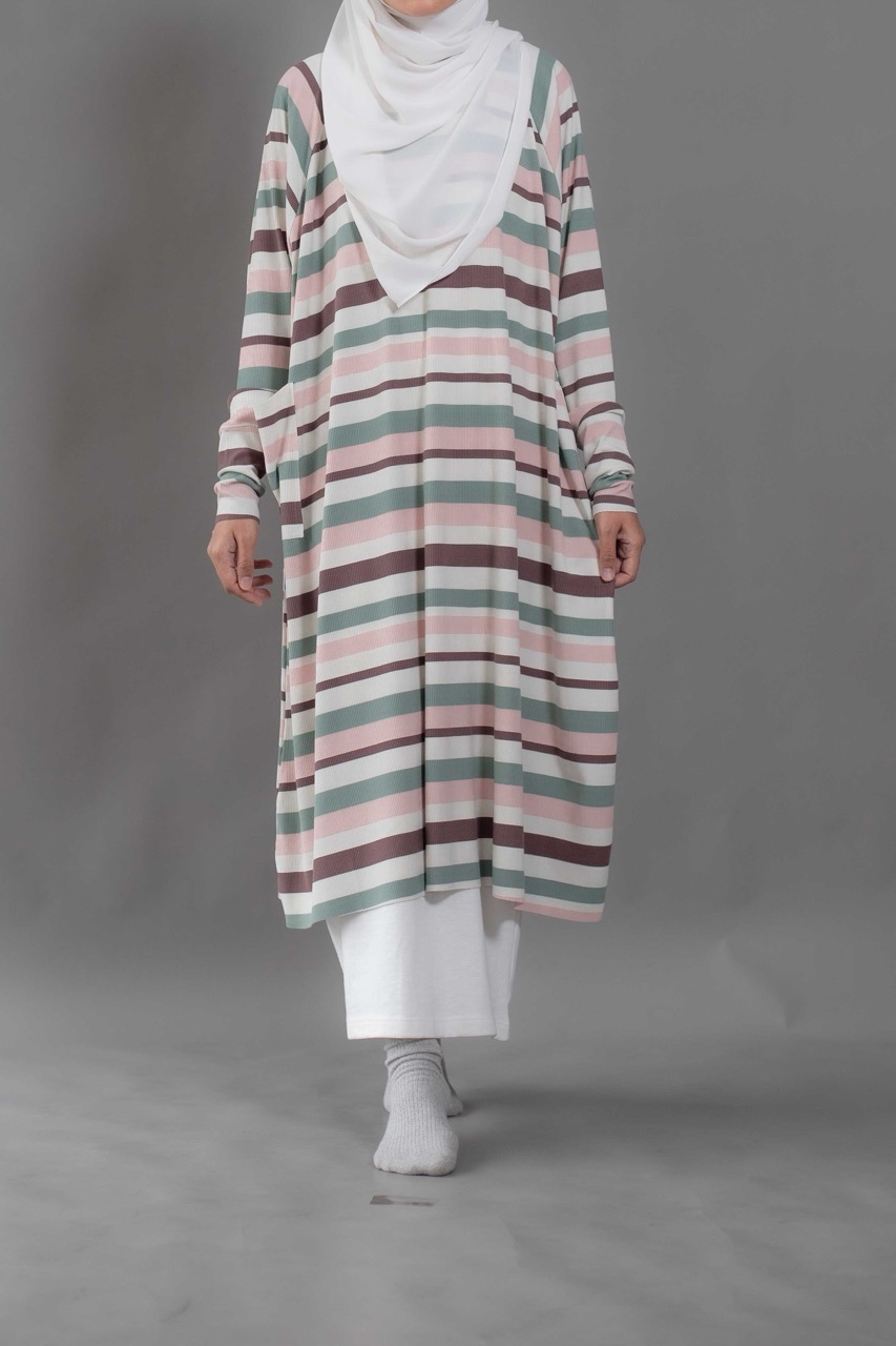 Cute and sophisticated, featuring timeless stripes and colorful, textured fabric. Designed with long raglan sleeves and a round neckline. Cuffed sleeves and raw hemming add a touch of dimension.